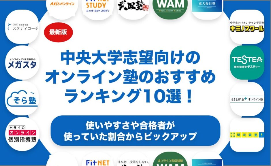 中央大学志望向けのオンライン塾をおすすめのランキング形式で10個紹介します。中央大学志望向けのオンライン塾を探している方におすすめの選び方や選ぶ上でのポイントも合わせて解説します。中央大学志望向けのオンライン塾を料金や特徴で比較しながら解説します。中央大学志望向けのオンライン塾の中でも自分に合ったものを見つけたいという方はぜひ参考にしてみてください。