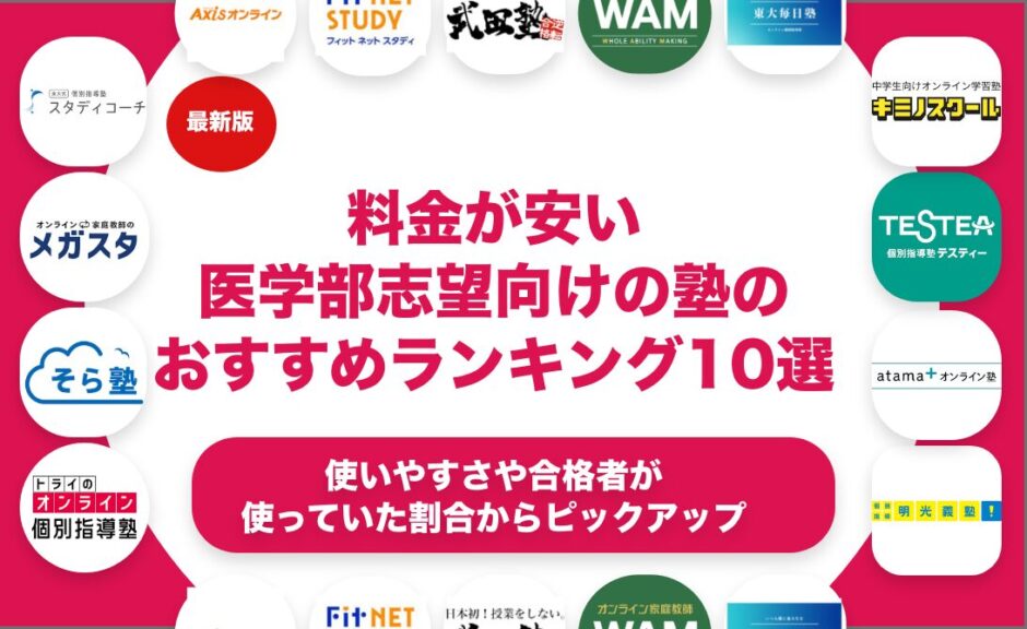 料金が安い医学部志望向けの塾をおすすめのランキング形式で10個紹介します。料金が安い医学部志望向けの塾を探している方におすすめの選び方や選ぶ上でのポイントも合わせて解説します。料金が安い医学部志望向けの塾を料金や特徴で比較しながら解説します。料金が安い医学部志望向けの塾の中でも自分に合ったものを見つけたいという方はぜひ参考にしてみてください。