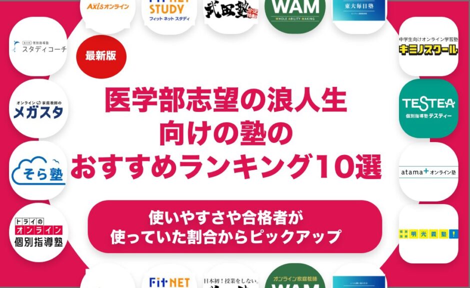 医学部志望の浪人生向けの塾をおすすめのランキング形式で10個紹介します。医学部志望の浪人生向けの塾を探している方におすすめの選び方や選ぶ上でのポイントも合わせて解説します。医学部志望の浪人生向けの塾を料金や特徴で比較しながら解説します。医学部志望の浪人生向けの塾の中でも自分に合ったものを見つけたいという方はぜひ参考にしてみてください。