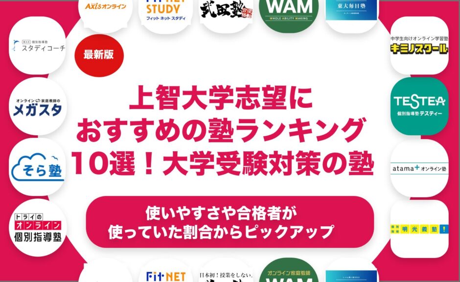 上智大学志望の大学受験対策におすすめの塾をランキング形式で10個紹介します。上智大学志望の受験生で大学受験対策を効率的に進めたいという方におすすめの塾を個別指導形式の塾から学習管理型の塾から勉強計画を作成してくれる塾から集団塾や進学塾までそれぞれ紹介します。上智大学に合格したいという大学受験生はぜひ参考にしてみてください。