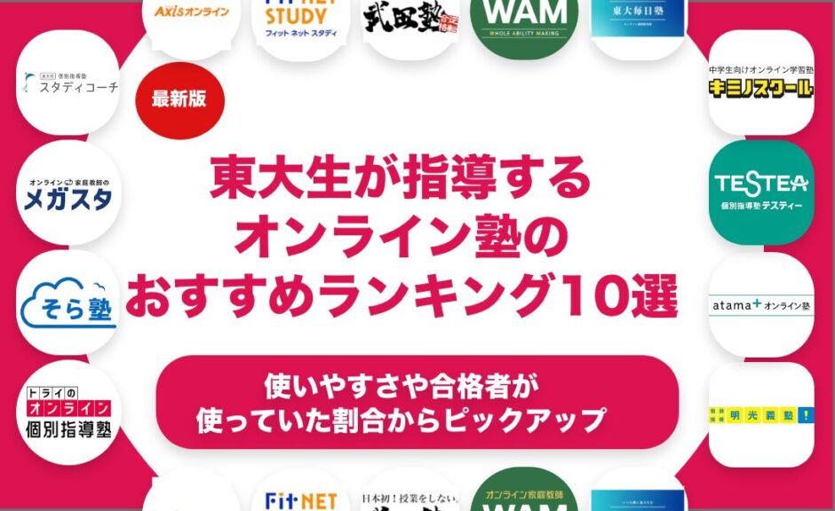 東大生が指導してくれるオンライン塾をおすすめのランキング形式で10個紹介します。東大生が指導してくれるオンライン塾を探している方におすすめの選び方や選ぶ上でのポイントも合わせて解説します。東大生が指導してくれるオンライン塾を料金や特徴で比較しながら解説します。東大生が指導してくれるオンライン塾の中でも自分に合ったものを見つけたいという方はぜひ参考にしてみてください。